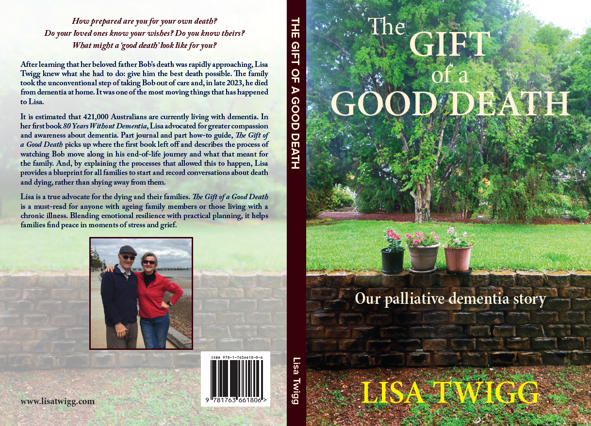At the time of the books launch Lisa's Dad, Bob, was still alive, though he was in the advanced stage of disease. Bob passed away just over two months later, a peaceful death at home surrounded by his loving family. Lisa was once again inspired to write about their family's experience - this time about palliation in the context of dementia, and in particular about choice at the end of life. The book is titled "The Gift of a Good Death. Our palliative dementia story" and launched in November 2024.